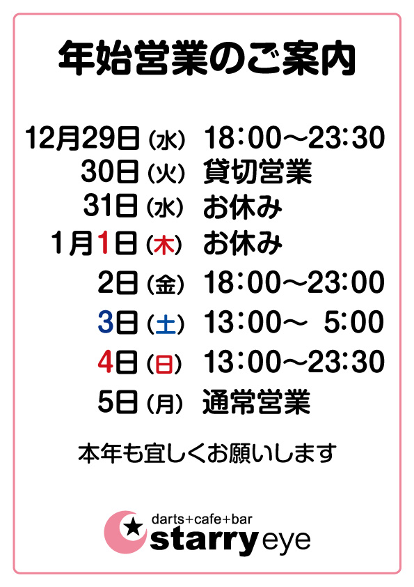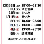 年末年始の営業のご案内です